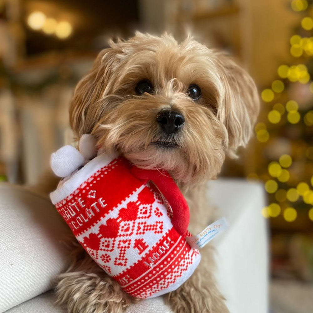 This festive trio brings together holiday favorites: the Starbarks Holly Cup, a Green Stars Seasons Grrreetings bone, and the cozy Haute Chocolate plush drink. Each toy is made from soft plush with an engaging squeaker, perfect for pups who love variety in their play. Whether fetching, chewing, or posing for holiday photos, this Christmas dog toy bundle delivers seasonal style, humor, and interactive fun for dogs of all sizes.